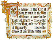 To believe in the Life of Love, to walk in the Way of Honor, to serve in the Light of Truth; this is the Life, the Way, and the Light of Sigma Nu; this is the Creed of our Fraternity.